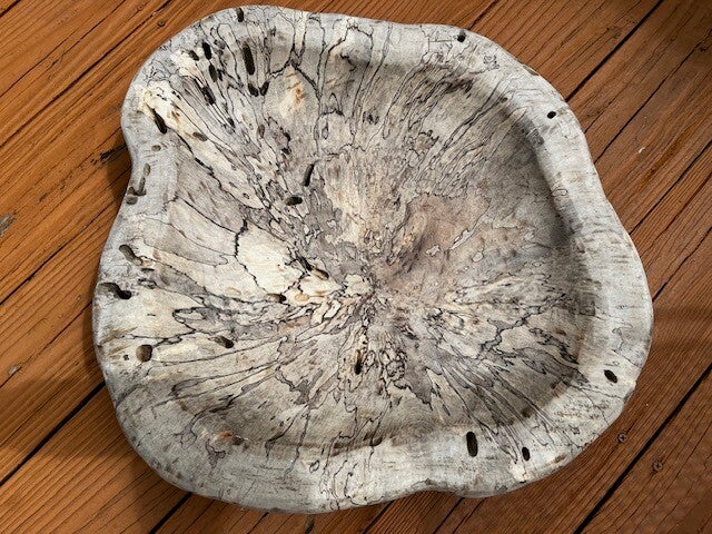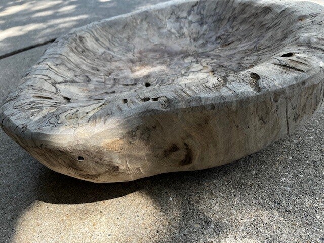 As you can see, this tree was under stress. The holes were created by bugs that infected the tree and unique lines & color patterns, called Spalting, indicate that the tree was in early stages for decay.