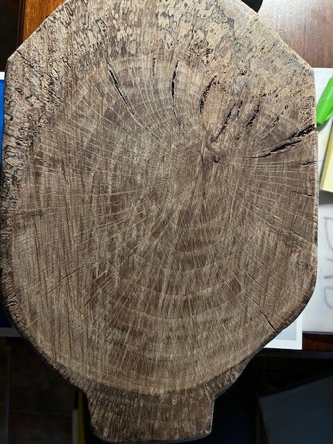 This riser was power carved from a slab of wood cut from the branch of a Live Oak tree that fell during hurricane Ida in 2021. Live Oaks can easily live 100 years or more. Historically, they were used in construction for beams and posts because the strong and dense wood. They can weigh 50 pounds per cubic foot. In fact, the U.S.S. Constitution reportedly received its nickname, "Old Ironsides," during the War of 1812 because of its live oak hull.