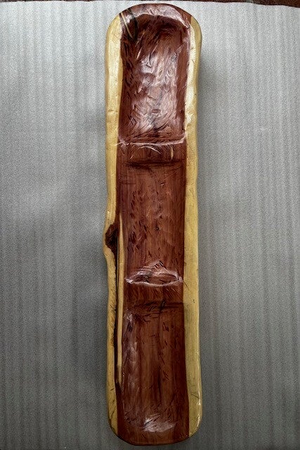 This dough bowl was power carved from a limb of a large Red Cedar tree that fell during hurricane Ida in 2021. This large tree was located at the corner of Bell and N. White Street just off historic Esplanade Avenue near city park.
