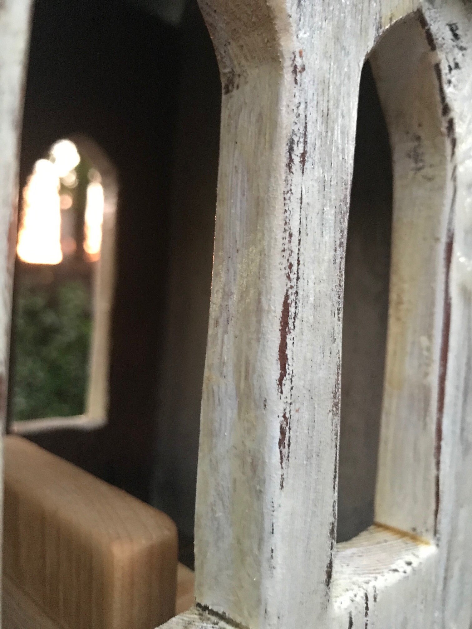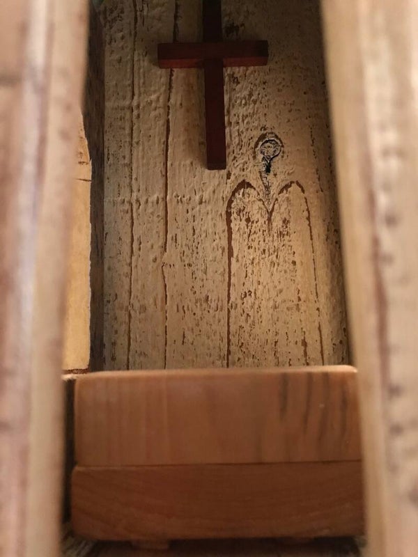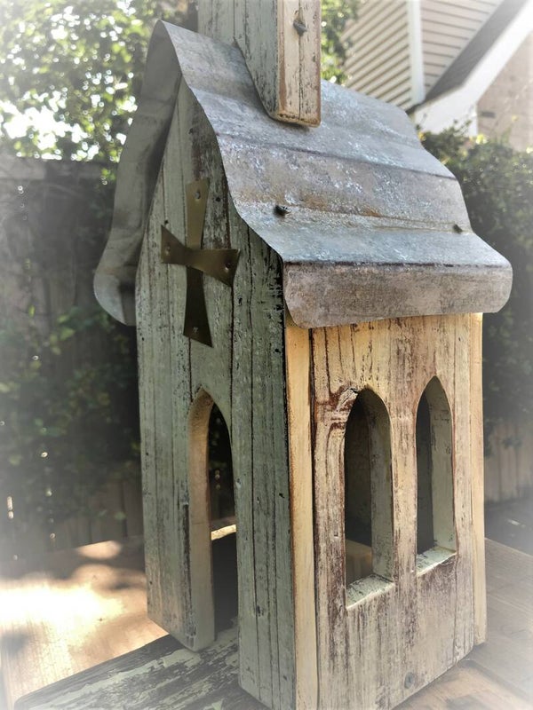This decoration was custom made using old discarded wood found in New Orleans. The 4 sides of this church were crafted from fence boards found in the mid-city area and the wood on the floor was made from an old window framing board pulled from a dumpster on N White St. near historic Esplanade Ave in New Orleans. This piece of wood easily dates over 100 years old and still has the original paint that has been sanded to expose the different layers of colors used throughout its history. You may notice old nail holes or mounting hardware where door/shutter hinges were once fastened. When you peak inside, you will see a simple pew facing the crucifix, symbolizing the peace and solitude we experience while in prayer.