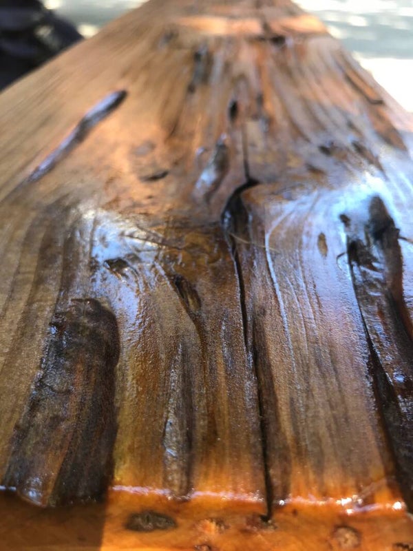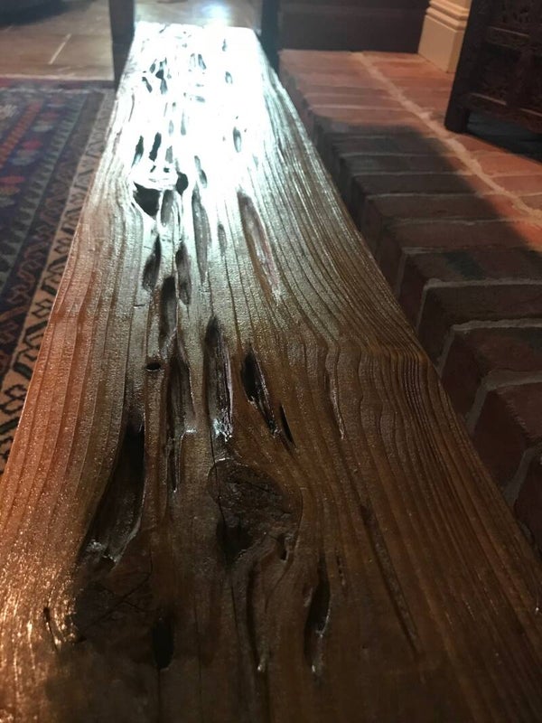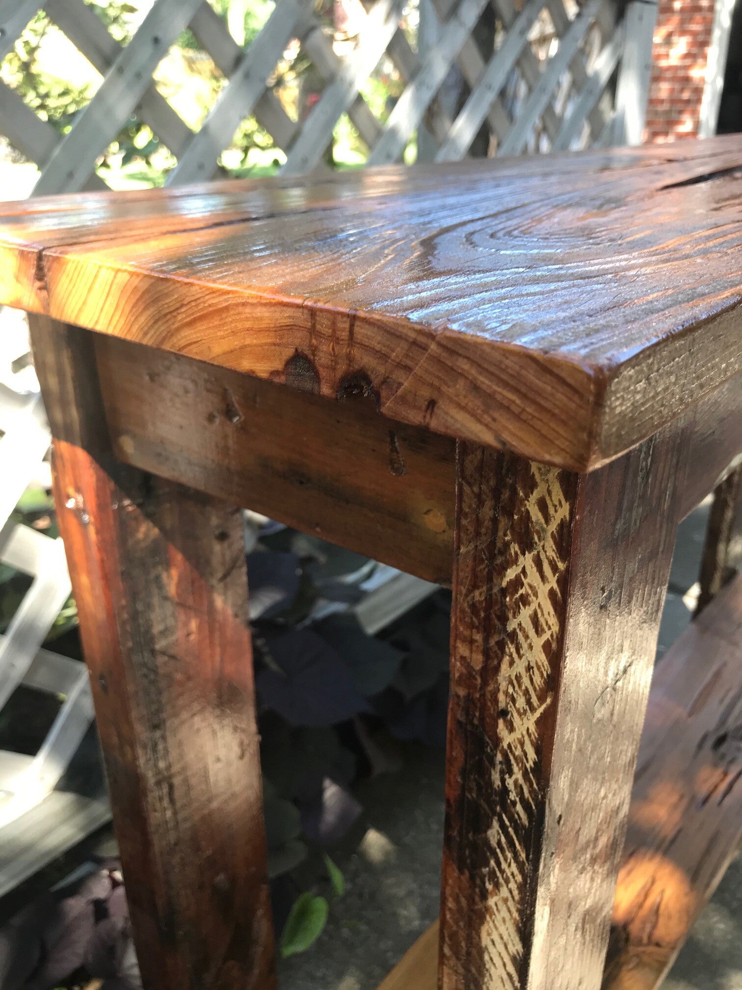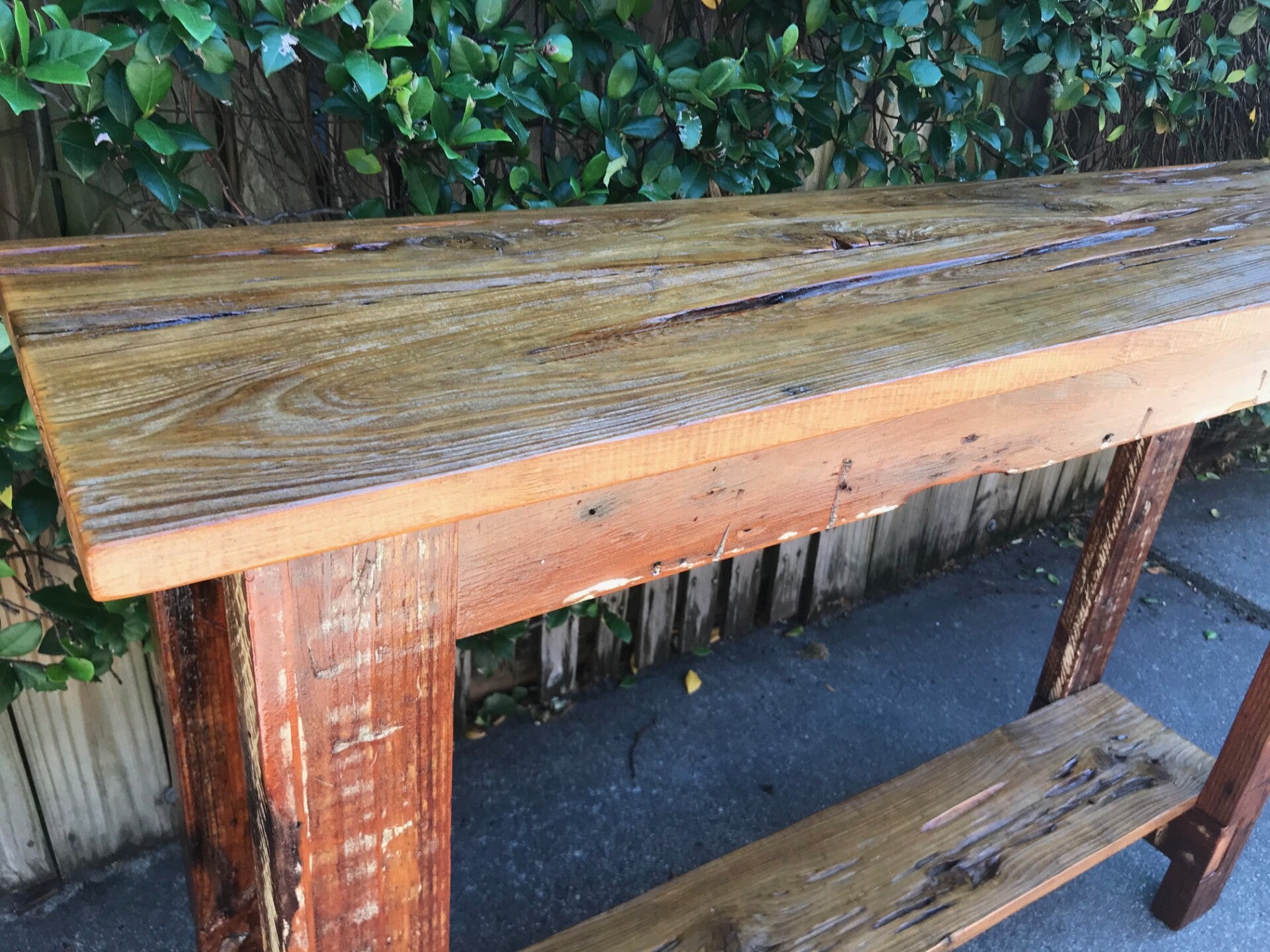 This furniture was custom made using reclaimed wood from several sources. The shelves on this table were salvaged from an old pecky cypress door / shutter found in Baton Rouge, La. The “peck” (worm like hole) is a natural distortion in the wood caused by fungus growing on the trees in the humid Louisiana swamps. The legs and base of the table are made from reclaimed wood pulled out of a dumpster on N. White St. near historic Esplanade Ave. in New Orleans where they were demoing an old house. Some of this is non-uniform framing lumber typically found in attics of old homes and some is original door/window trim. If you look closely, you will notice nail holes and mounting hardware features, such as where door/shutter hinges were once fastened. You will also notice some of the original paint on the trim boards that I purposely left to retain some of its history.