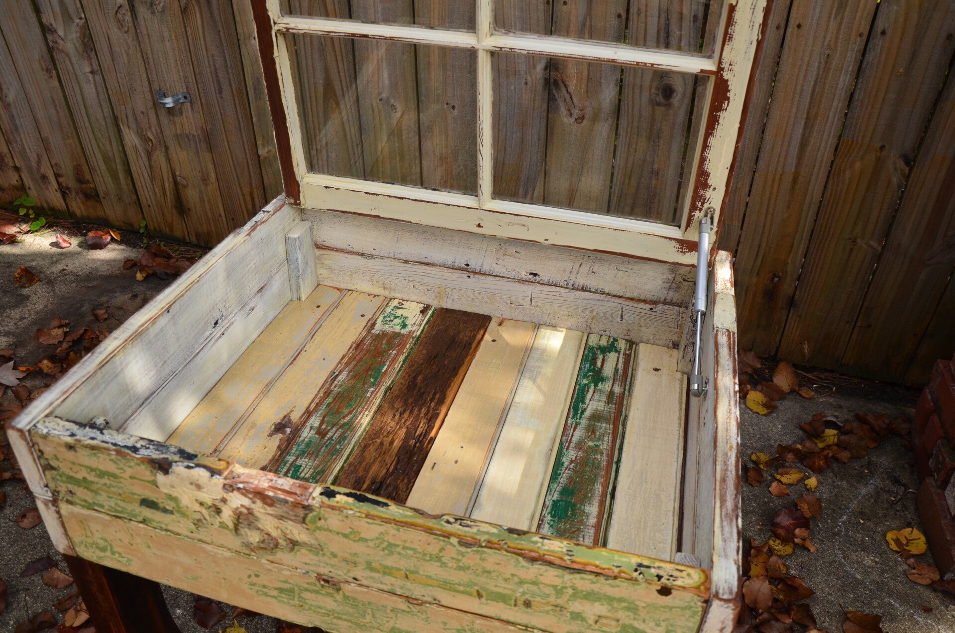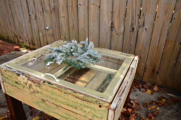 This furniture was custom made using an old reclaimed window as a table top and old cypress door and window framing as the sides to the storage base. The bottom of the storage compartment is made of old discarded oak floor boards pulled out of a dumpster on N Rendon St. near historic Esplanade Ave in New Orleans. The dark board in the storage compartment was cut from an old cypress floor board found floating in the Atchafalaya Basin near Lafayette, LA. The legs were made from old non-uniform framing lumber typically found in attics in old NOLA homes. Most of the outside of the table is the original paint colors that have been sanded to expose the layers of paint used throughout the history of each piece. You will notice old nail holes and mounting hardware / features, such as where door/shutter hinges were once fastened.