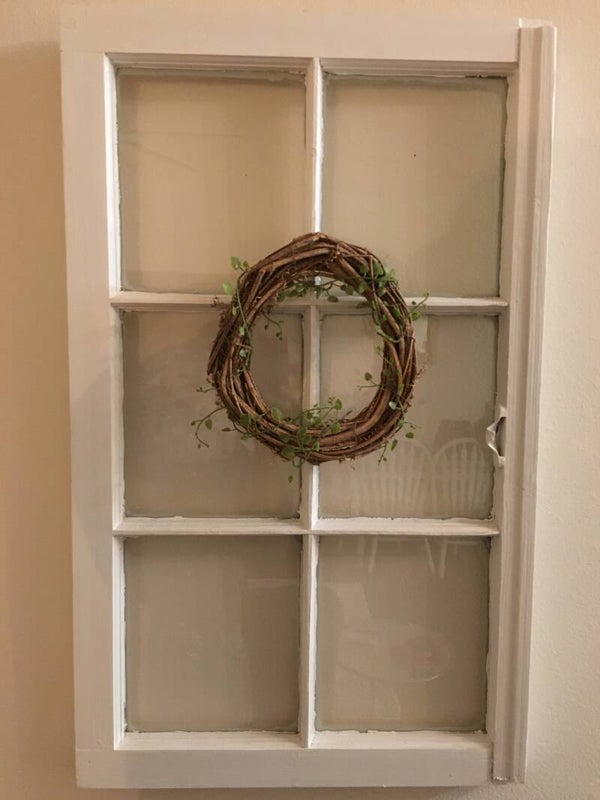This fixture is an old reclaimed window from a NOLA house that has been repurposed as wall decor with a charming farmhouse appeal. It was lightly painted and sanded to expose the original paint and then varnished to provide an antique look. Most of the glass is original and if you are lucky you can find imperfections / waves in the old glass, original hardware and distress in the wood.