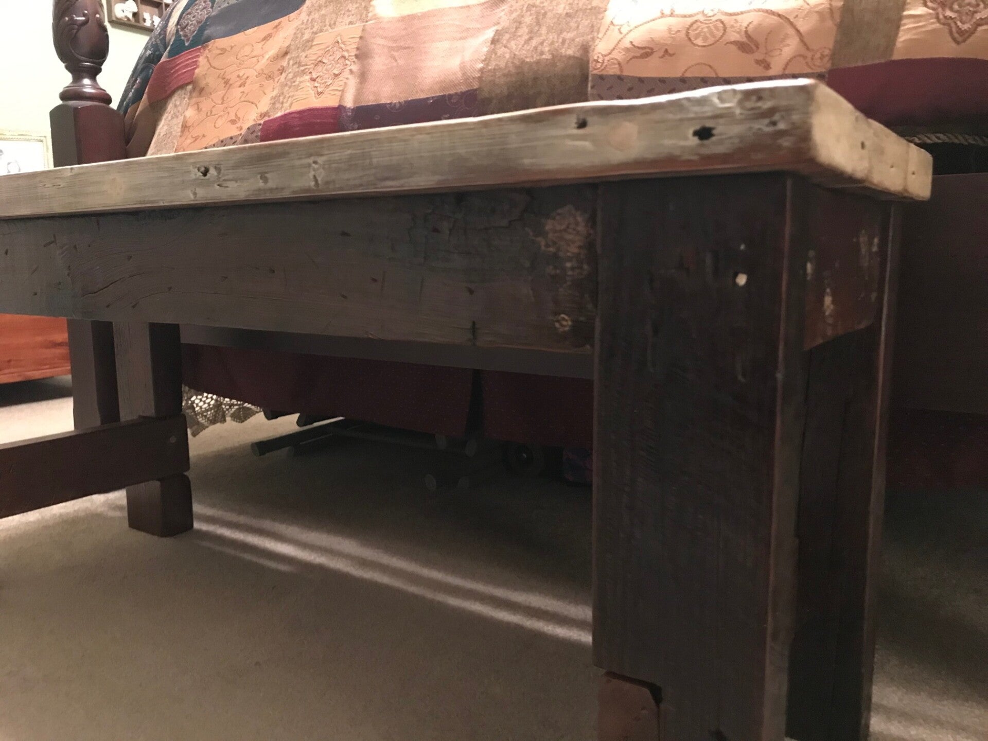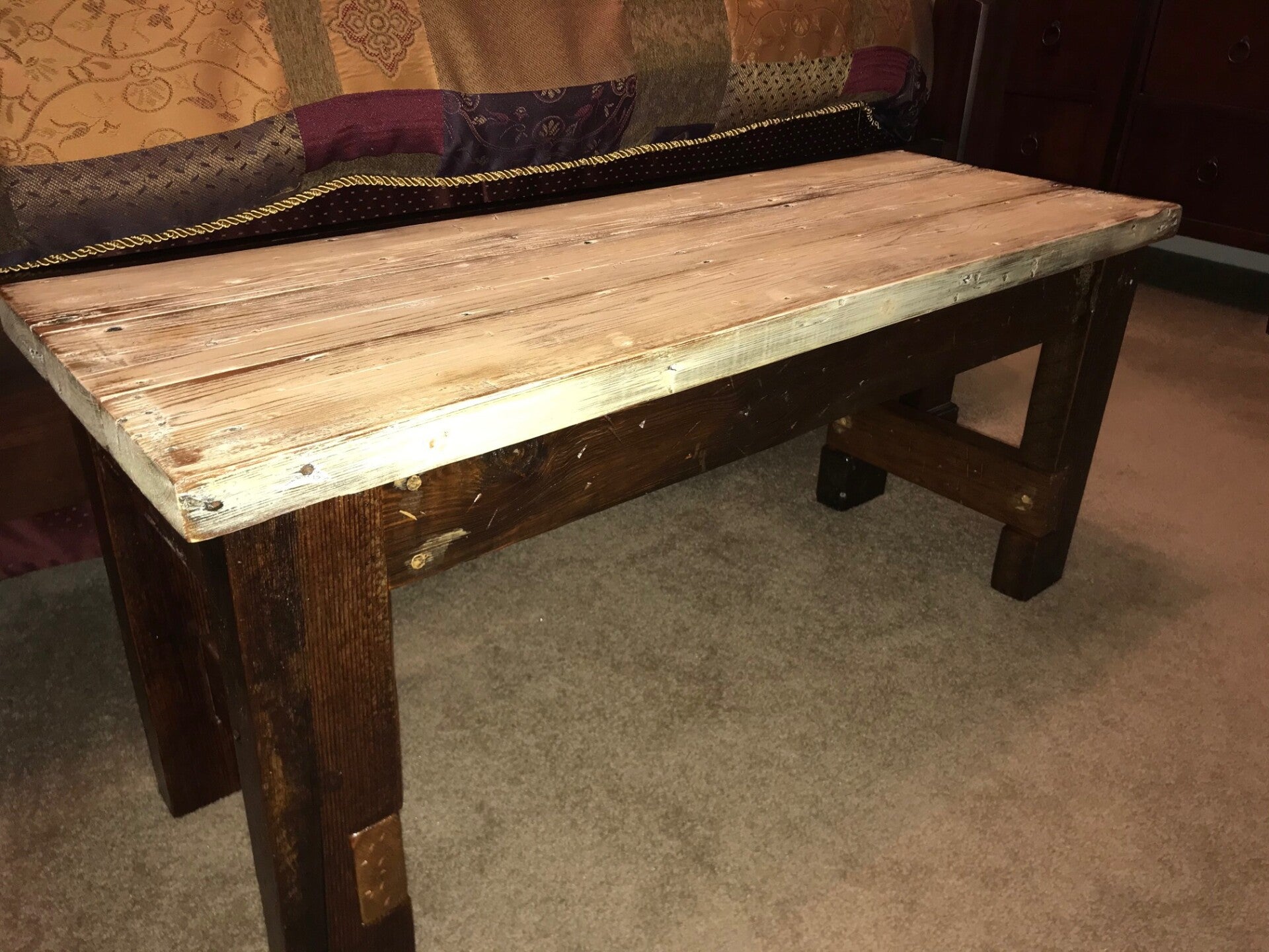 This furniture was custom made using an old discarded wood that had been reclaimed from a dumpster on N Rendon St. near historic Esplanade Ave in New Orleans. The base and legs were made from old non-uniform framing lumber typically found in attics of old NOLA homes. The seat is made from old window framing boards, which contains the original paint colors that have been sanded to expose the different layers of paint used throughout the history of the wood. You will notice old nail holes and mounting hardware / features, such as where door/shutter hinges were once fastened.