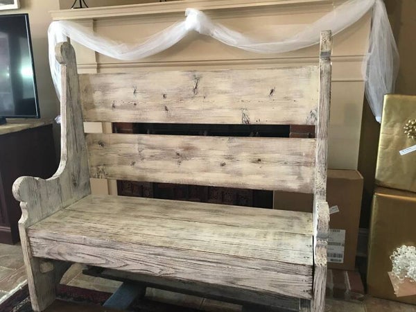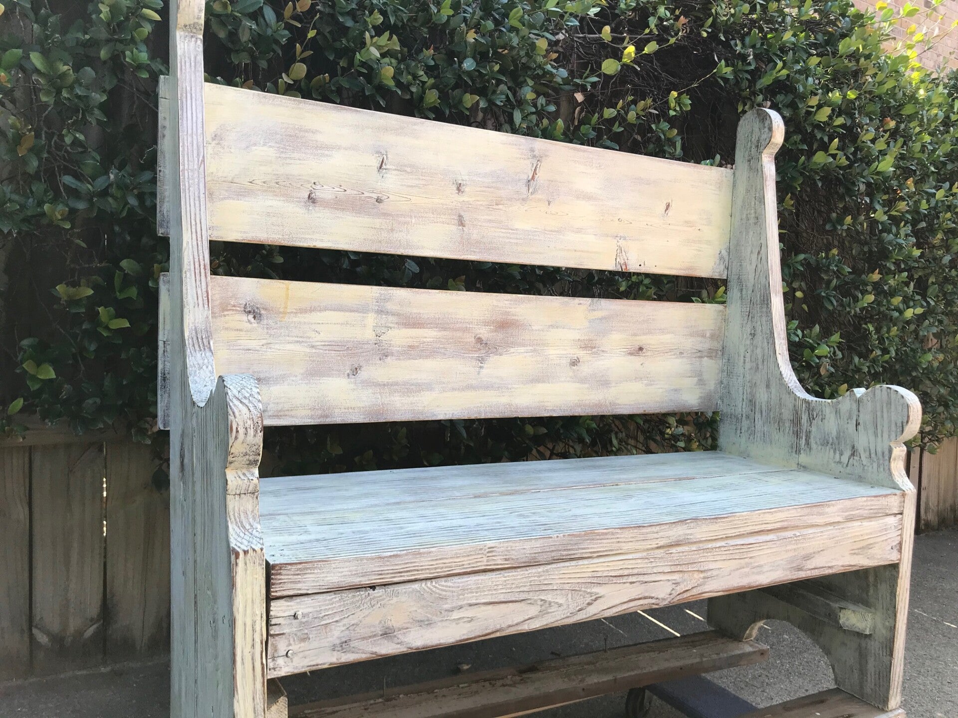 This pew was homemade and salvaged from a neglected property in Baton Rouge, LA. It has been pressure washed, sanded, painted and polyurethaned to give it an old antique look. It is well constructed and is ready for many years of use.