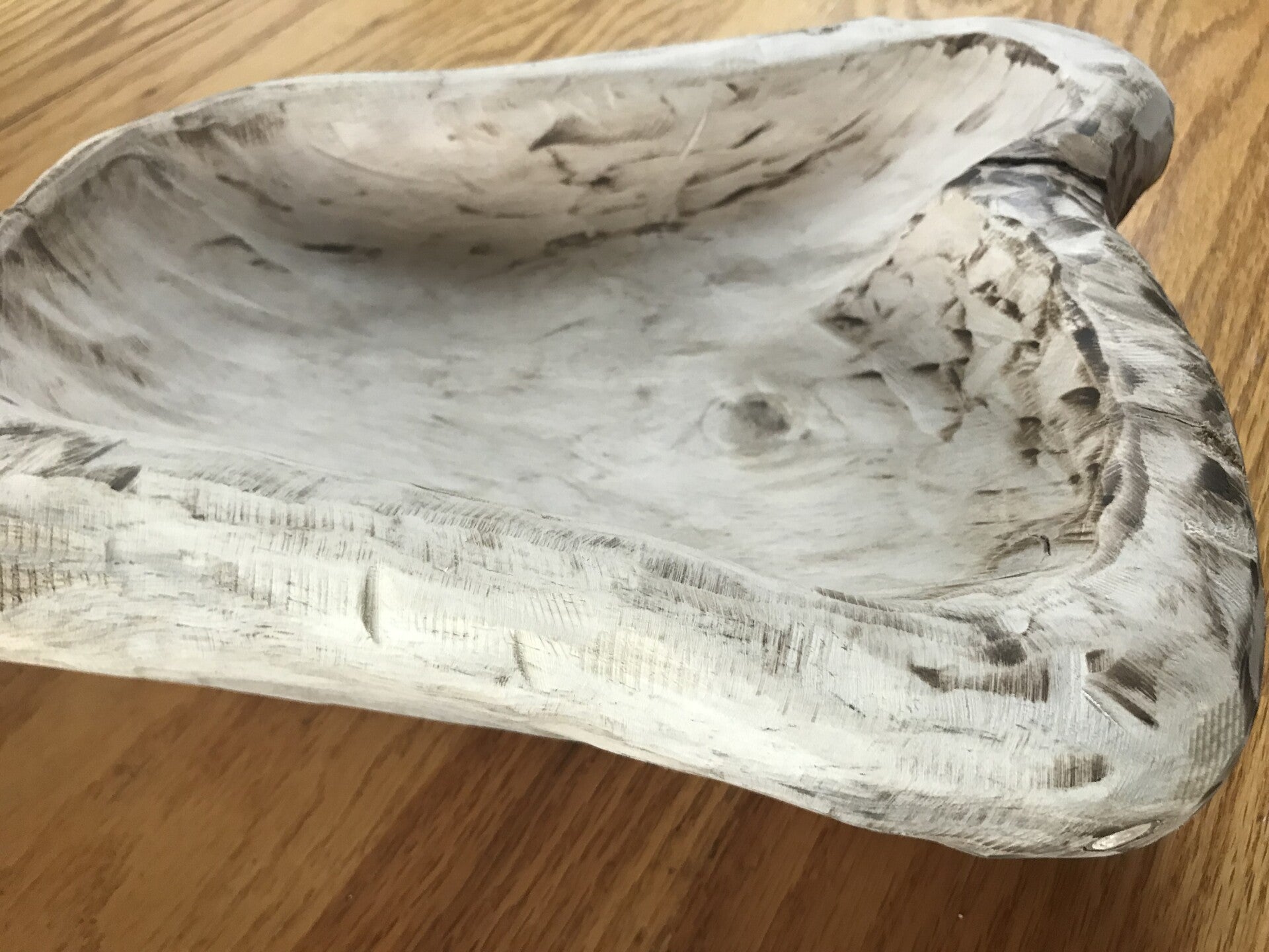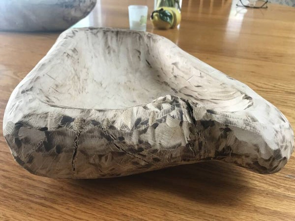 This piece has been dried, carved and whitewashed to accent the beauty of the natural colors. The wood was accumulated and crafted in 2021.