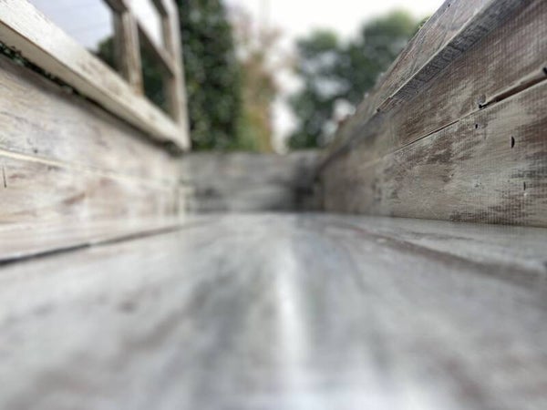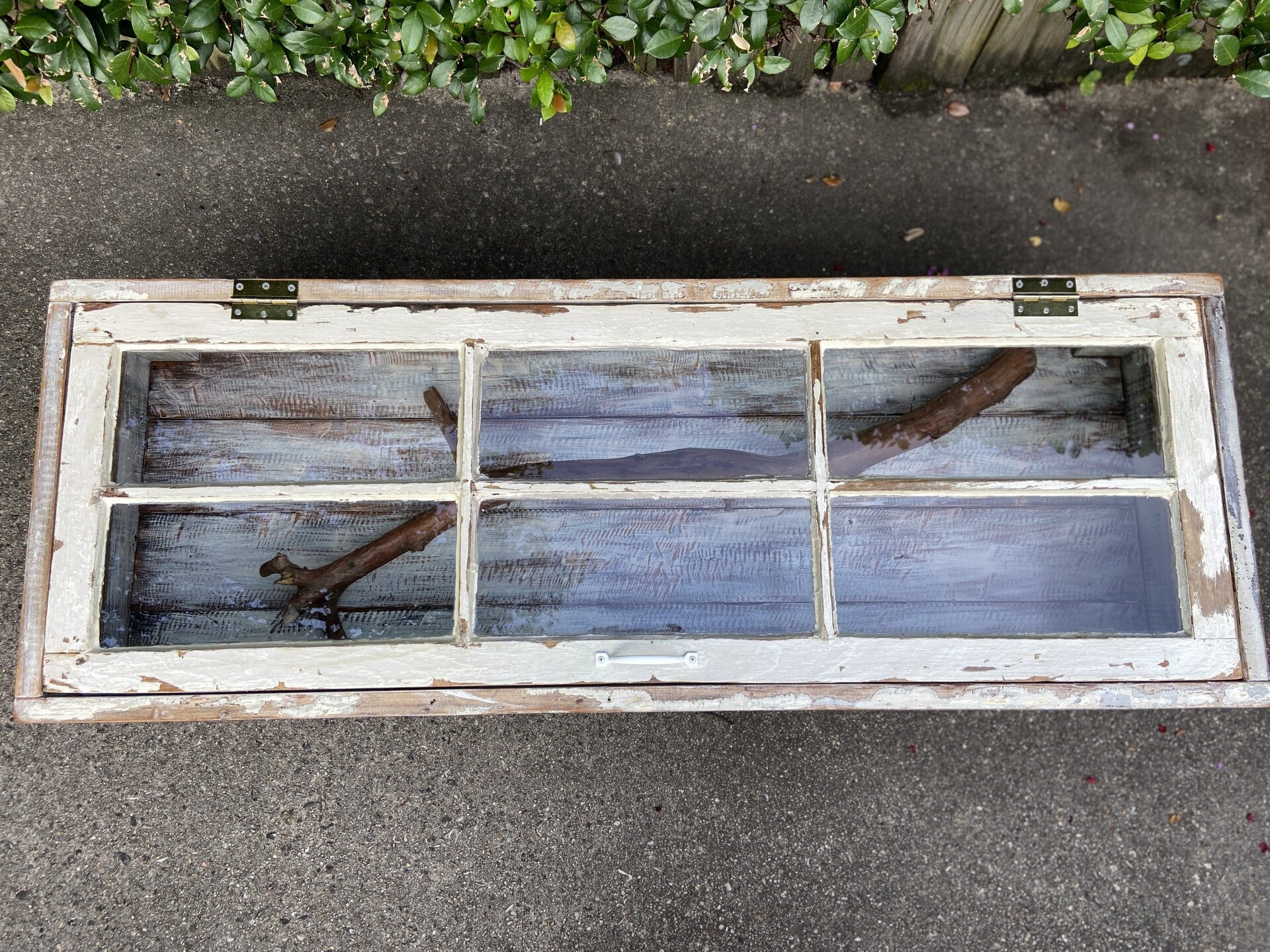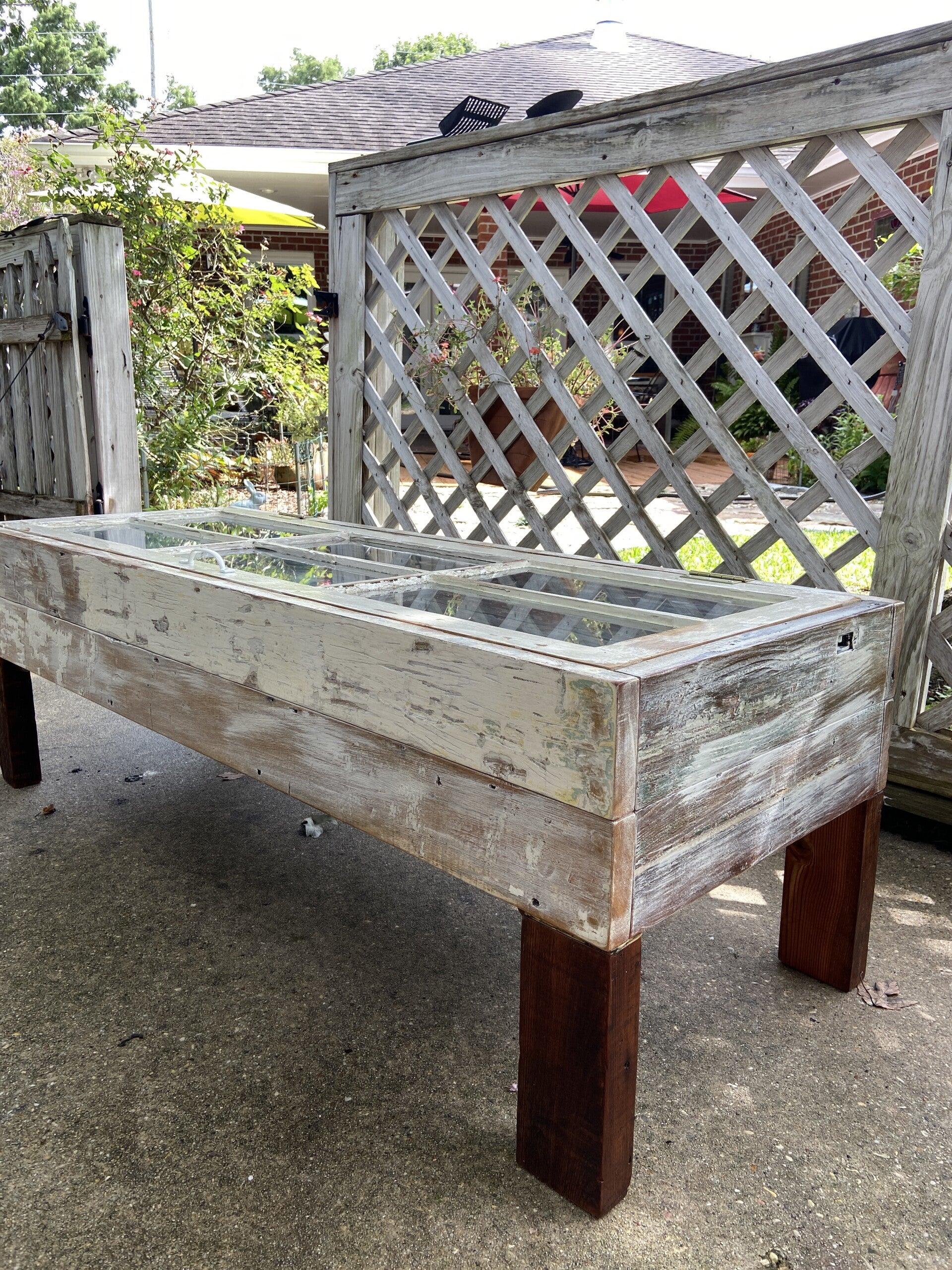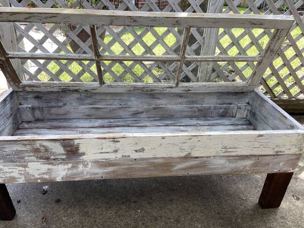 This furniture was custom made using an old reclaimed window as a table top and old door and window framing as the sides to the storage base. The bottom of the storage compartment is made of discarded floor boards and the legs were made from non-uniform framing lumber typically found in attics in old NOLA homes. All this wood was pulled out of a dumpster on Bell St. near historic Esplanade Ave in New Orleans. Most of the outside of the table has the original paint colors that have been sanded to expose the layers of paint used throughout the history of each piece. You will notice old nail holes and mounting hardware / features, such as where door/shutter hinges were once fastened.