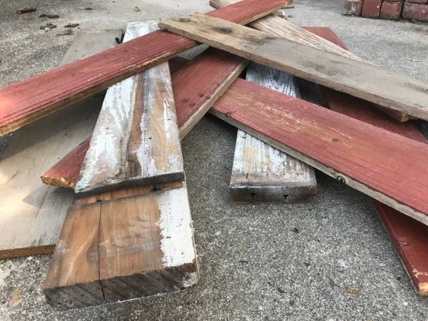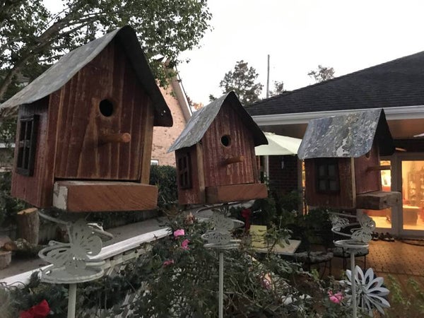 This piece of decor was custom made using old discarded materials found in New Orleans. The 4 sides of this birdhouse were crafted from fence boards found in the mid-city area. The roof was made from very old round gutters that you can still find on historic NOLA homes. The garden stakes were found discarded on Moss St. on bayou St. John. The floor was made from an old window framing pulled from a dumpster on N White St. near historic Esplanade Ave. This piece of wood easily dates over 100 years old and still has the original paint that has been sanded to expose the different layers of colors used throughout its history. You may notice old nail holes or features where door/shutter hinges were once fastened.