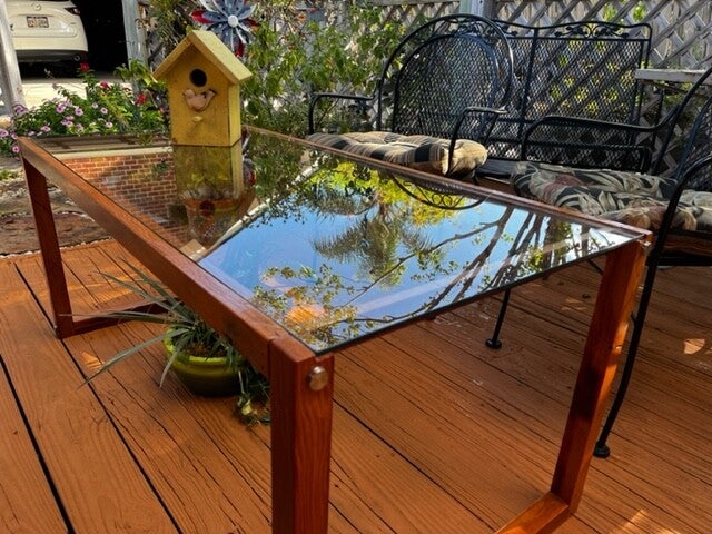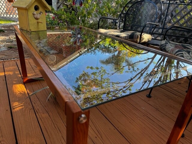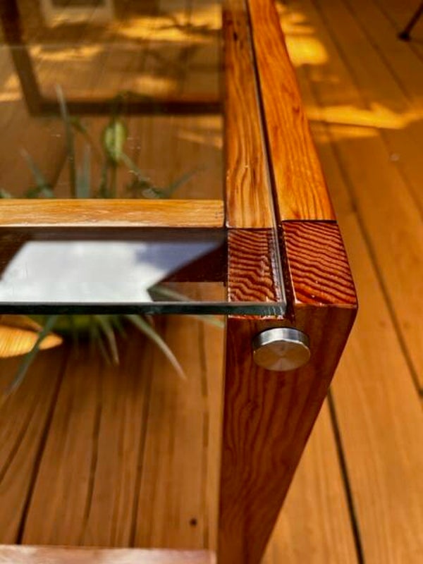 This custom made coffee table boast a very simple, yet unique and warm design that balances glass with the natural texture and colors of old repurposed wood. This wood base was crafted from reclaimed fir beams that came from a renovation at St. Matthews Church in River Ridge while the glass was reclaimed from an old office desk.