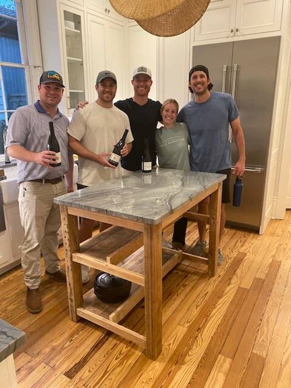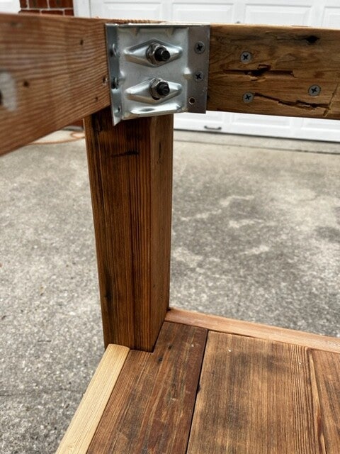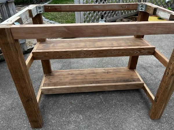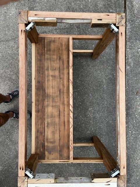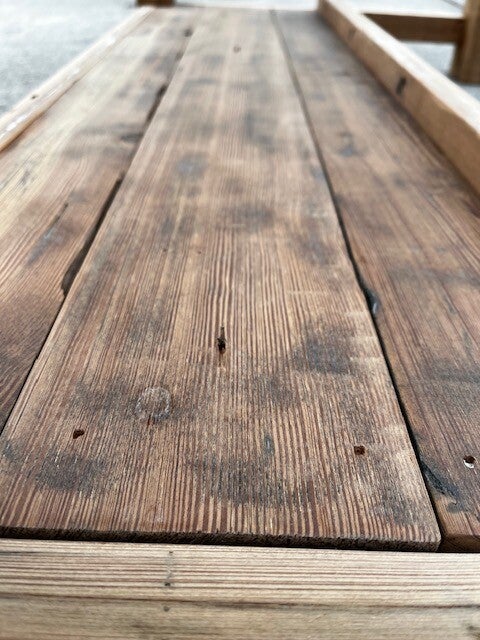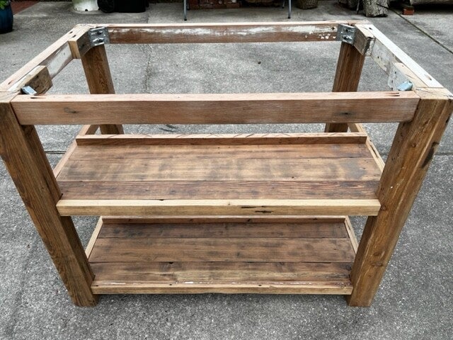 This custom made kitchen island boast a very simple, yet unique design that balances natural wood colors with the texture of old repurposed lumber. All of the wood was reclaimed from several homes near historic Esplanade Ave. in New Orleans. The legs were crafted from lumber typically found in attics of old homes, while the shelving was made from reclaimed cypress floor boards. The apron was cut from fir beams that came from a renovation at St. Matthews Church in River Ridge. If you look closely, you will notice nail holes, distressed features and some of the original paint that was purposely left on the wood to retain its history.